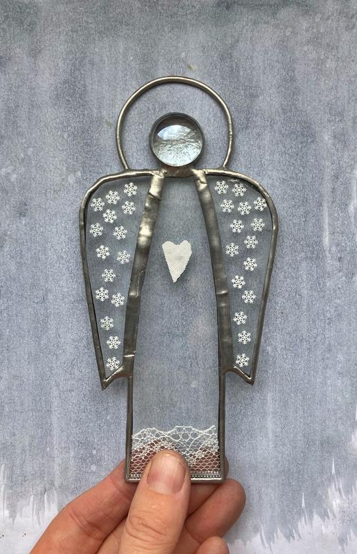Ручна робота зі скла. Простий силует з крилами, прикрашеними сніжинками, і маленьким серцем у центрі. Легкий, прозорий, добре виглядає як новорічний декор. Підійде для декору або як невеликий символічний подарунок. Розмір: 18 см Упаковка: подарункова