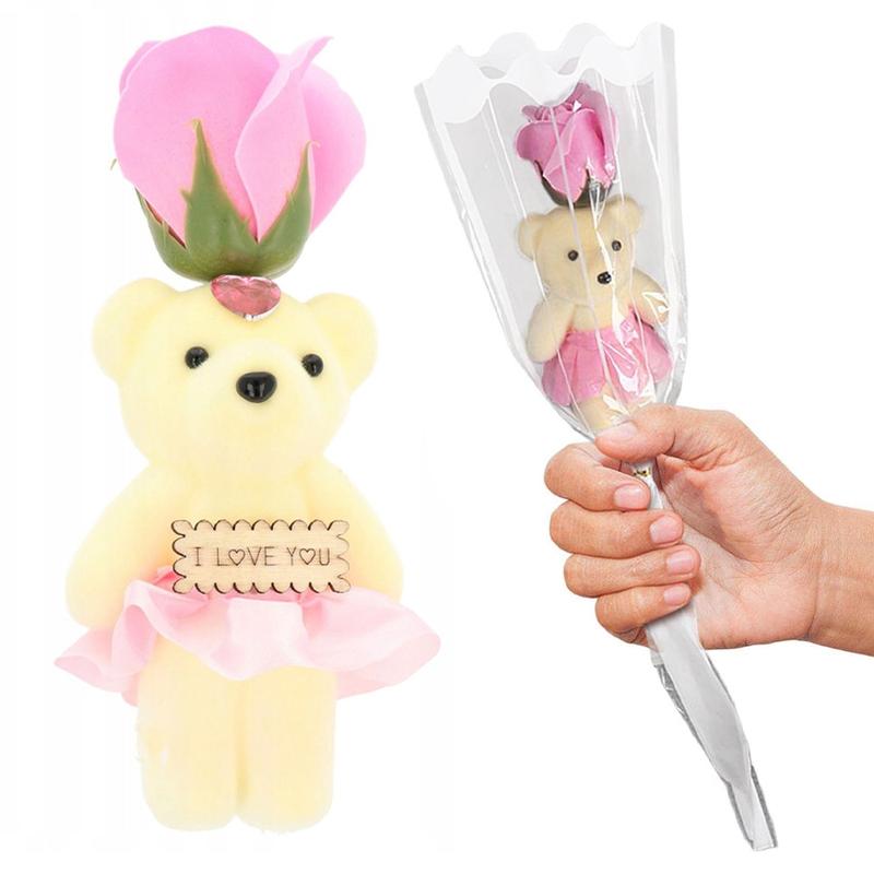 Мыльная роза на палочке с мишкой, с подсветкой, 45 см