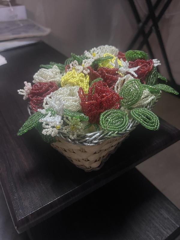 Розы из бисера в корзине,размеры 15*11*10.Отличный подарок .