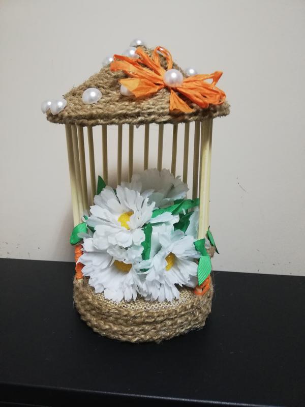 Выполнен из шпажек деревянных, джута. полу-бусин,. цветов. Прекрасный подарок на все праздники. Размер 25х11см.