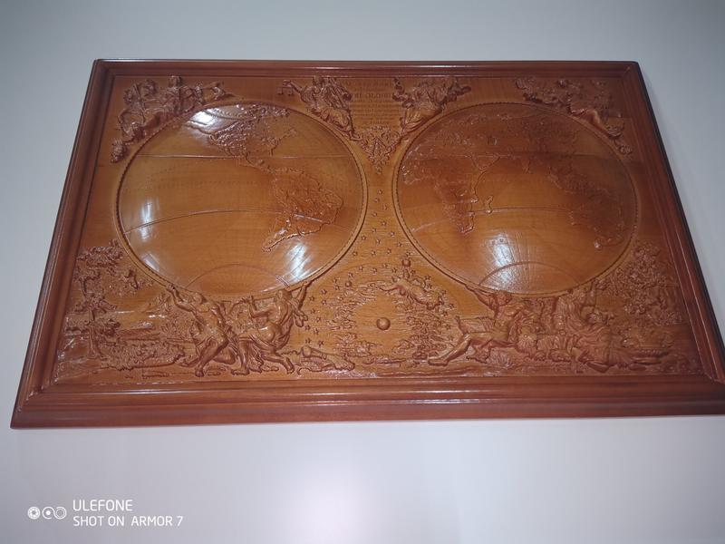 ПАННО РЕЗНОЕ "КАРТА МИРА" Панно изготовлено из ясеня(щит). Покрытие - тонировка + глянцевый лак. Размер:560*360*35 мм