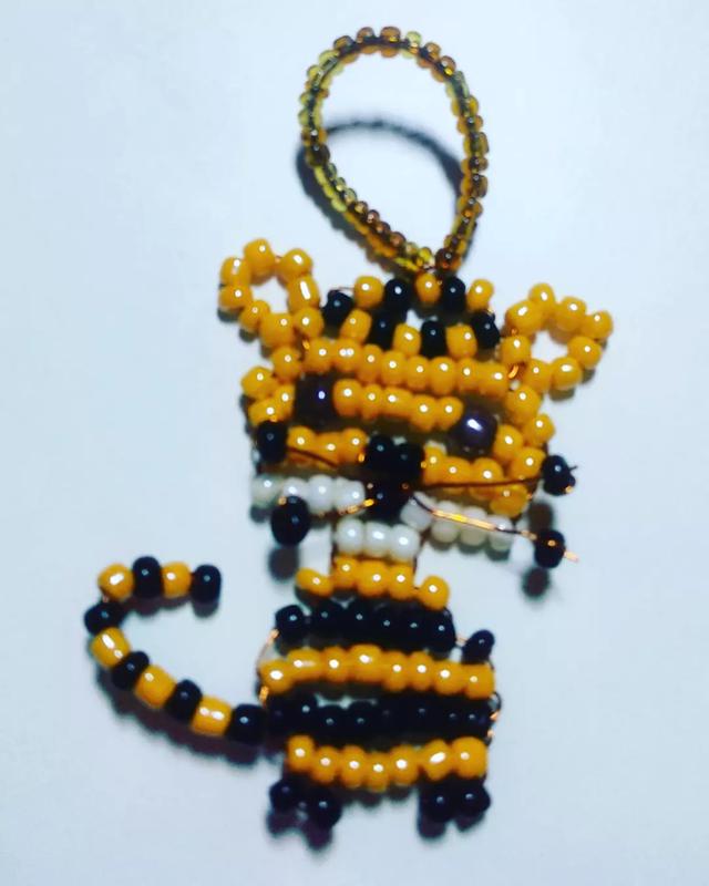тигренок из бисера на проводе. размер - около серенчатой упаковки( без шлевки). приятный подарок, брелок на ключе или сумка/рюкзак, как елочное украшение, сувенир.