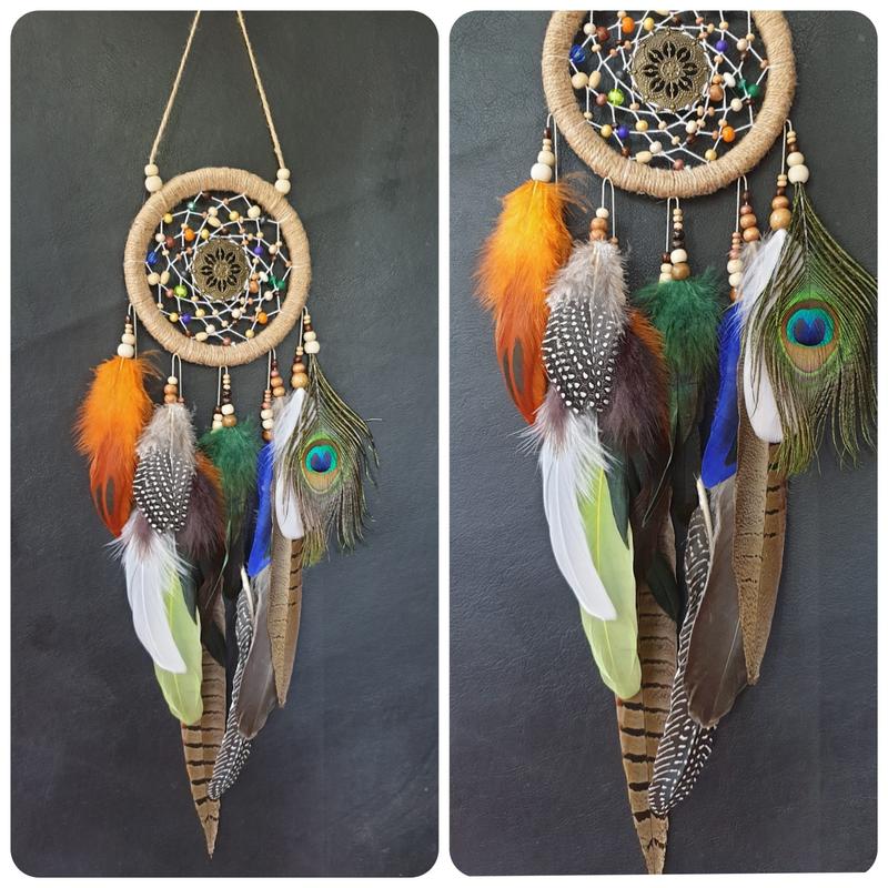 Лесной ловец снов ,перья микс-ястреб,фазан ,цесарка петуха,дикой утки,индюк. Диаметр 14 см длина 48см. Оберег Ловец снов - не просто ловушка для сновидений. Это мощный оберег, який обладает многими свойствами: - Ловец снов охраняет и защищает своего владельца от негативных воздействий, энергий, кошмаров. - Ловец снов отгоняет дурные мысли. - Ловец снов способствует хорошему, здоровому, восстанавливающее силы сна. - Ловец снов умиротворяет, стабилизирует перепады настроения и дарит внутреннее спокойствие. - Отлично дополняет ваш интерьер, делает его более уютным Размещенный над вашей кроватью, он может сделать потрясающий декор