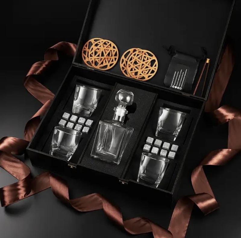 Полное описание набора: Черная коробка из натурального дерева: 34.6см * 44.2см * 14см с стандартной гравировкой WHISKY STONES на внешней стороне, перевязанная лентой; графин; 4шт - стаканы; 4шт - элегантные деревянные костеры под стаканы; 16шт - стеатитовых камушков для охлаждения виски; Деревянные щипцы; Кожаный мешочек для камешков; Инсталкция по использованию камушек.