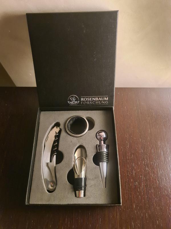 Комплект підручних інструментів для сомельє і не тільки міцність та довговічність; ергономічність та комфорт у використанні; компактні розміри та легка вага; подарункова коробка. Універсальний винний набір - доречний варіант для подарунка друзям та знайомим. Комплектація: нож-штопор, пробка, кільце для пляшки, лійка. Виробництво Німеччина.