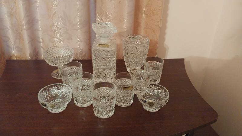 Продам окремо чеський набір для віскі та цукерниці з вазою. До набору для віскі входять 6 склянок по 240 мл + штоф 700 мл. Набір для віскі має свою оригінальну упаковку. Справжній чеський кришталь містить оксид свинцю 24%, що надає виробам вражаючу прозорість і чистоту, неймовірний блиск. Продукція із кришталю відповідає всім європейським і українським стандартам якості. Саме чеська кришталева продукція визнана досвідченими поціновувачами у всьому світі. Окремо набір для віскі - 1900 грн Набір з цукерниць та вази - 700 грн