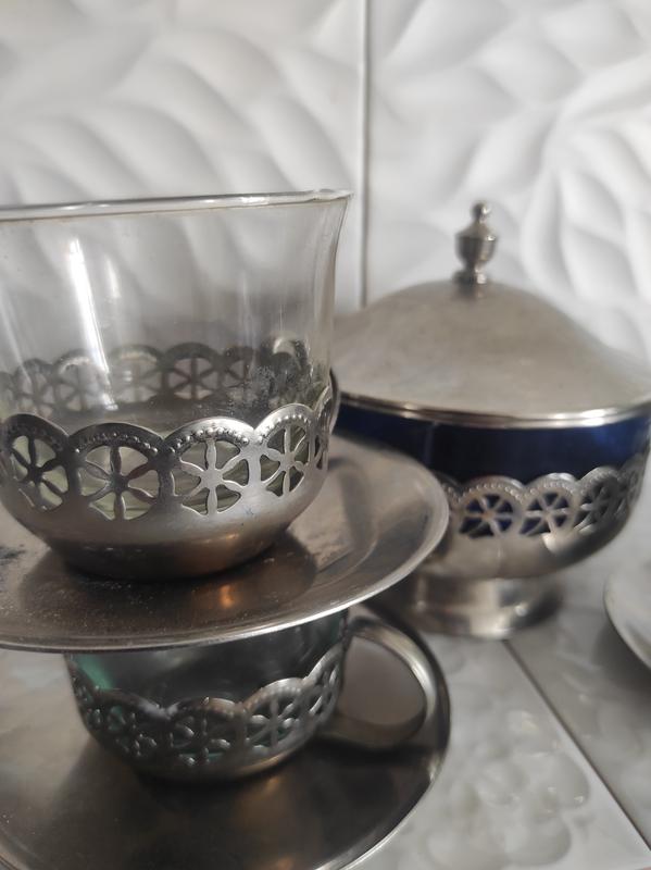 набор в отличном состоянии. сахарница,четыре блюдца,стакана,подстаканника.