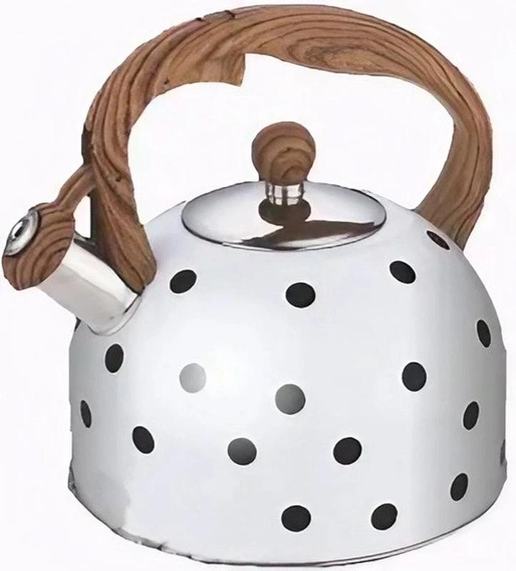 Характеристики - Бренд: EMPIRE - Материал: Нержавеющая сталь. - Объем: 2,5 л - Тип дна: Трехслойное - Цвет: Белый горох - Диаметр верхней части: 8.5 см - Диаметр дна: 19 см - Высота с ручкой: 21 см - Ширина с носиком: 21 см. - Крышка: Эбонит дерево - Ручка: Эбонит неподвижное дерево - Свисток: Да - Хранение в холодильнике: Да - Посудомоечная машина: Да - Упаковка: фирменная коробка - Страна производитель: Китай