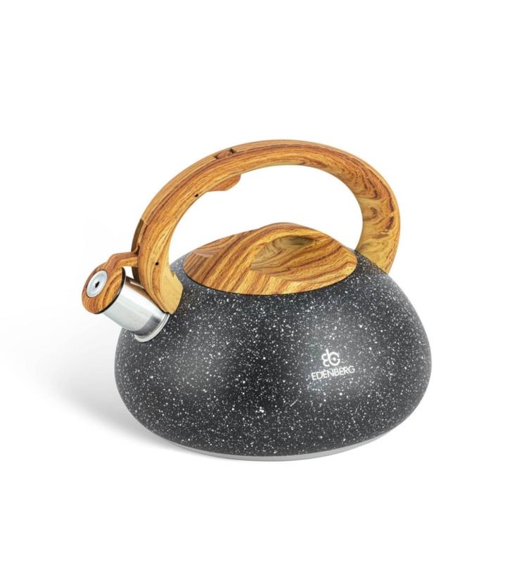 Удобный чайник сферической формы с мраморным покрытием от фирмы Edenberg. Такой экземпляр готов встретить Вас каждое утро, в обед и вечером. Edenberg EB-8802 может в считанные минуты вскипятить воду. Изделие выполнено из высококачественного и безопасного для здоровья материала, который не будет влиять на вкус воды. Edenberg EB-8802 со свистком, из нержавеющей стали, снаружи матовое мраморное покрытие. Ручка под дерево с покрытием Soft-touch. Имеет индукционное дно. Подходит для всех видов плит. Закипание сопровождается звуковым сигналом, так как носик чайника имеет насадку-свисток, что позволяет контролировать процесс кипячения воды. Специальный механизм позволяет легко и удобно открывать насадку-свисток одним нажатием кнопки. Ручка из бакелита не нагревается – она эргономична и приятно ложится в руку. Характеристики чайника Edenberg EB-8802 Тип: чайник Материал: нержавеющая сталь Объем: 3 л Мраморное покрытие Тип ручки: фиксированная Материал ручки: бакелит Свисток: есть Тип дна: многослойное, индукционное Форма: сферическая.
