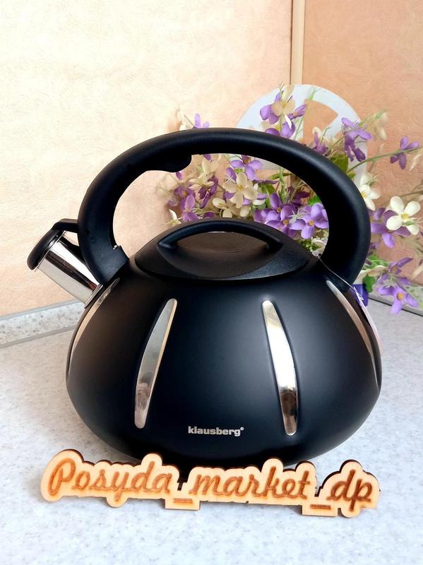 Чайник 3л Klausberg KB-7548 Характеристика: Объем чайника: 3л. Высота с ручкой-20 см. Диаметр дна-17 см. Цвет: черный, матовый. Материал ручки: бакелит. Материал чайника: нержавеющая сталь покрытая жаростойкой краской. Автоматический свисток, отклоняемый кнопкой. Подходит для всех типов плит, включая индукцию Производитель: Klausberg (Польша).
