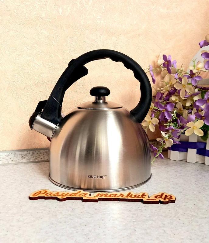 Чайник 1,5 л KingHoff KH3324 Об'єм: 1,5 л Чайник зі свистком. Виготовлений із високоякісної неіржавкої сталі. Матеріал ручок — бакеліт. Підходить для всіх плит, включно з індукційними. Виробник: KingHoff (Польща).