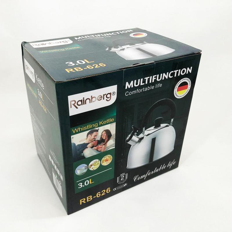 🛡️ Чайники для плит Rainberg RB-626 3 л, Чайник из нержавеющей стали с пищалкой, Чайник для электроплиты ZQ-67 🛠️ ЧайникRainberg RB-626 очень качественный и удобный. Чайник Rainberg является антибактериальным и имеет высокие показатели экологическойчистоты. 🛠️ Даже через много лет этот чайник будет прекрасно выглядеть исохранит свои свойства. Чайник Rainberg-626 это покупка, которая прослужитмногие годы! 🛠️ Ручка в чайнике не нагревается, она выполнена избакелита. Чайник оснащен свистком, который всегда напомнит озакипевшей воде. Он поднимается с помощью механического нажатия на специальныйклапан. 🛠️ Подходит для газовых, электрических, стеклокерамических,галогеновых плит и можно мыть в посудомоечной машине. 🛠️ Характеристики: - 🔘 Тип ручки: подвижная. - 🔘 Многослойное дно. - 🔘 Общий объем чайника: 3 л. - 🔘 Свисток: есть. - 🔘 Материал ручки: бакелит. - 🔘 Материал чайника: нержавеющая сталь. ➡️ Комплектация: - 🔘 Чайник - 🔘 Коробка 📌 Дополнительные параметры - 🔘 Производитель: Rainberg - 🔘 Состояние: Новое - 🔘 Свисток: Есть - 🔘 : 3.0 (л) - 🔘 Страна производитель: Китай - 🔘 Материал чайника: Нержавеющая сталь - 🔘 Тип дна: Многослойное - 🔘 Цвет ручки: Черный - 🔘 Цвет: Серебристый - 🔘 Материал ручки: бакелит - 🔘 Тип ручки: Подвижная