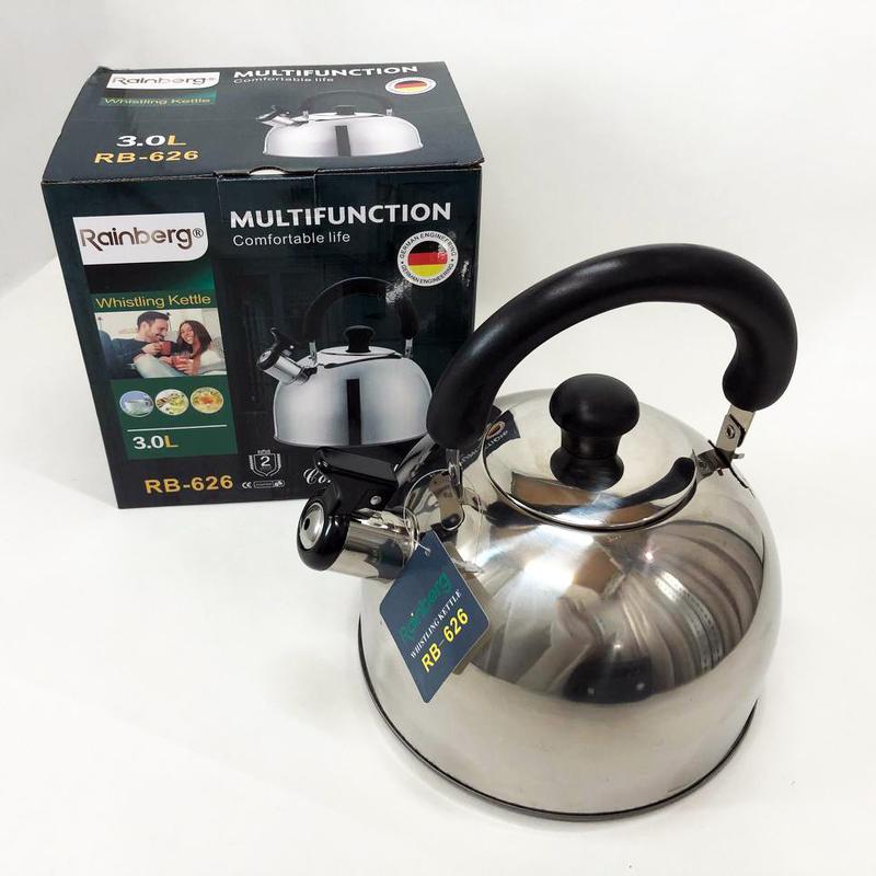 🏆 Металлический чайник Rainberg RB-626 3 л, Качественный чайник из нержавеющей стали со свистком SY-45 💡 ЧайникRainberg RB-626 очень качественный и удобный. Чайник Rainberg является антибактериальным и имеет высокие показатели экологическойчистоты. 💡 Даже через много лет этот чайник будет прекрасно выглядеть исохранит свои свойства. Чайник Rainberg-626 это покупка, которая прослужитмногие годы! 💡 Ручка в чайнике не нагревается, она выполнена избакелита. Чайник оснащен свистком, который всегда напомнит озакипевшей воде. Он поднимается с помощью механического нажатия на специальныйклапан. 💡 Подходит для газовых, электрических, стеклокерамических,галогеновых плит и можно мыть в посудомоечной машине. 💡 Характеристики: - ✅ Общий объем чайника: 3 л. - ✅ Материал ручки: бакелит. - ✅ Свисток: есть. - ✅ Тип ручки: подвижная. - ✅ Многослойное дно. - ✅ Материал чайника: нержавеющая сталь. 🔺 Комплектация: - ✅ Коробка - ✅ Чайник 📦 Дополнительные параметры - ✅ Тип дна: Многослойное - ✅ Страна производитель: Китай - ✅ Материал чайника: Нержавеющая сталь - ✅ Свисток: Есть - ✅ : 3.0 (л) - ✅ Цвет ручки: Черный - ✅ Тип ручки: Подвижная - ✅ Производитель: Rainberg - ✅ Материал ручки: бакелит - ✅ Состояние: Новое - ✅ Цвет: Серебристый