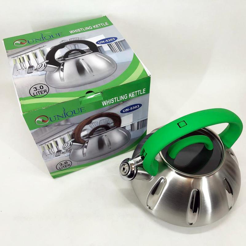 🔴ВИДЕО РАСПАКОВКИ ТОВАРА НИЖЕ!🔴 👉 Вы получите такой товар, как на видео! 👇Жми "Подробнее!"👇 📣 Чайник для чайной церемонии со свистком Unique, Хороший чайник со свистком газовый нержавейка YG-77 👉 Чайник Unique UN-5303 — воплощение практичности и красоты. UNIQUE UN-5303 изготовлен из высококачественной нержавеющей стали, которая одновременно очень легкая и прочная в использовании. Внутренняя сторона данного чайник имеет покрытие из нержавеющей стали, которое облегчает уход за чайником и безопасно для здоровья. Удобная ручка сделана из нейлона, а ее конструкция разработана так, что она не нагревается даже после длительного кипячения воды. Чайник оснащен специальным свистком, который сообщит Вам о том, что вода закипела. На ручке данной модели есть специальный рычажок, с помощью которого легко и просто можно открывать и закрывать свисток. Данный чайник подходит для всех типов плит. 👉 А что бы чайник Unique UN-5303 прослужил вам долго, необходимо перед первым использованием промыть чайник в теплой воде с моющим средством с помощью мягкой губки. Во избежание повреждений поверхности не используйте для мытья металлические губки, абразивные, едкие материалы а также хлор- и кислотно содержащие очистители. 👉 Характеристики товара - • Крышка: Жаропрочное стекло - • Материал ручки: Нейлоновая - • Покрытие: Нержавеющая сталь - • Наличие свистка: Есть - • Особенности Громкий свисток; Капсульное дно; Не нагревающаяся нейлоновая ручка - • Объем (л): 3 - • Совместимость с источниками тепла: Все виды плит 📌 Дополнительные параметры - • Страна производитель: Китай - • Общий объем чайника: 3.0 (л) - • Состояние: Новое - • Свисток: Есть - • Тип дна: Многослойное - • Цвет: Серебристый - • Тип ручки: Фиксированная - • Материал чайника: Нержавеющая сталь - • Цвет ручки: Зелёный - • Производитель: Unique - • Материал ручки: бакелит