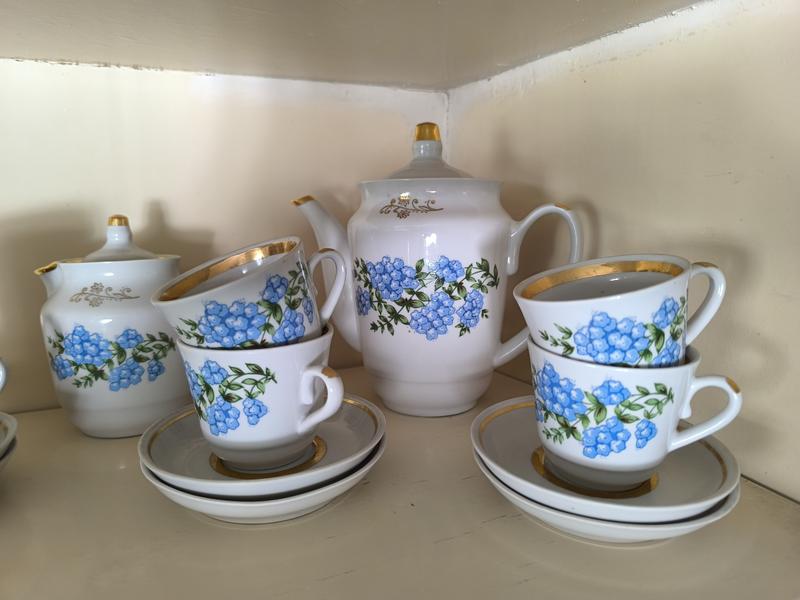кофейный сервиз с незабудками голубого цвета шесть чашек, с позолотой, клеймо Огородница на одни чашки трещина