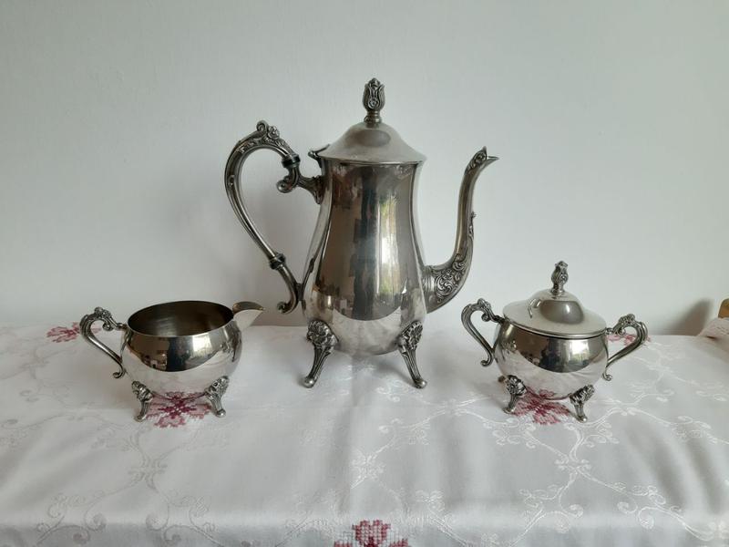 Винтажный набор, сервиз кофейный посеребренный В наборе: Чайник 1 л., сахарница, молочник Высота чайника 25см, высота сахарницы 12 см, молочник 8 см. Очень красивый посеребренный набор с выдумывающимися ручками. Доставка Новой или Укр-почтой.