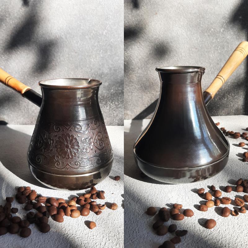 Для любителей кофе, есть два вида медных турок Корпус - Медь, внутреннее-пищевое олово Длинная деревянная ручка Утолщенное дно Зауженная к верху горловина Все это поможет приготовить вкусный ароматный кофе. С карбированием на 400 мл цена 800 грн Без карбирования 500 мл - 850 грн