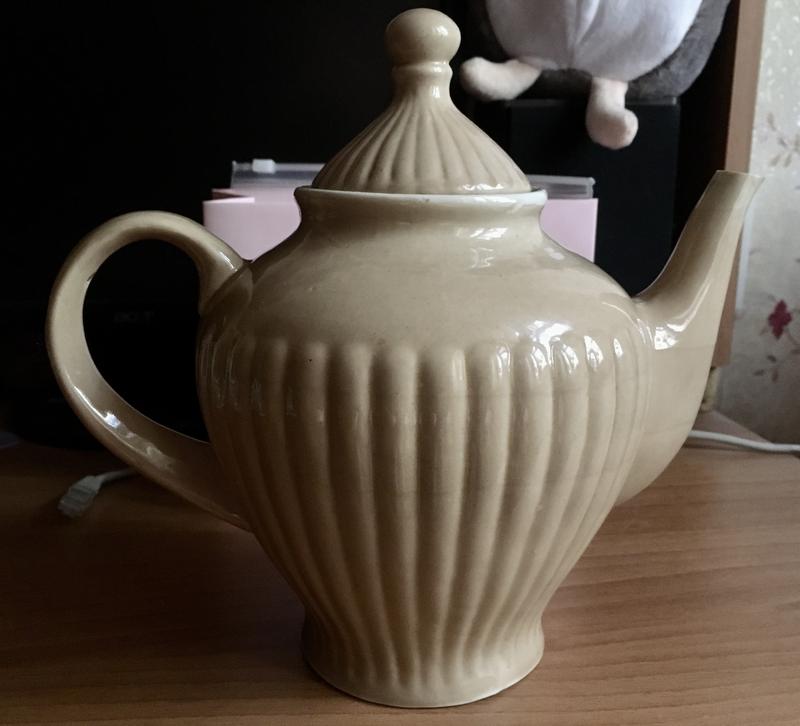 Керамический кофейник, высота с крышкой 20.5 см. Без крышки 15.5 см. Есть скол, в остальном идеальное состояние