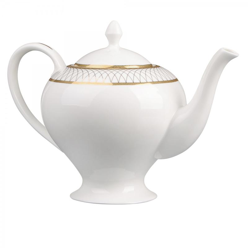Чайник об'ємом 1,35 л виготовлений з високоякісної порцеляни. Фарфор – один з найпопулярніших матеріалів для виготовлення посуду. Цю популярність він завоював завдяки своїй надзвичайній тонкості і легкості в поєднанні з надзвичайною міцністю. Він був винайдений давно, однак досі тримає першість завдяки цим якостям. До речі, якщо обережно вдарити по порцеляновому виробу, можна почути дуже красивий мелодійний звук, тональність якого буде залежати від товщини стінок. Чайник звужується до низу, а потім знову розширюється догори. Ручка і носик виготовлені в цьому ж стилі. Чайник в верхній частині прикрашений золотистим візерунком між двома досить широкими облямівками. Малюнок – дрібний орнамент в класичному грецькому сенсі (меандр).