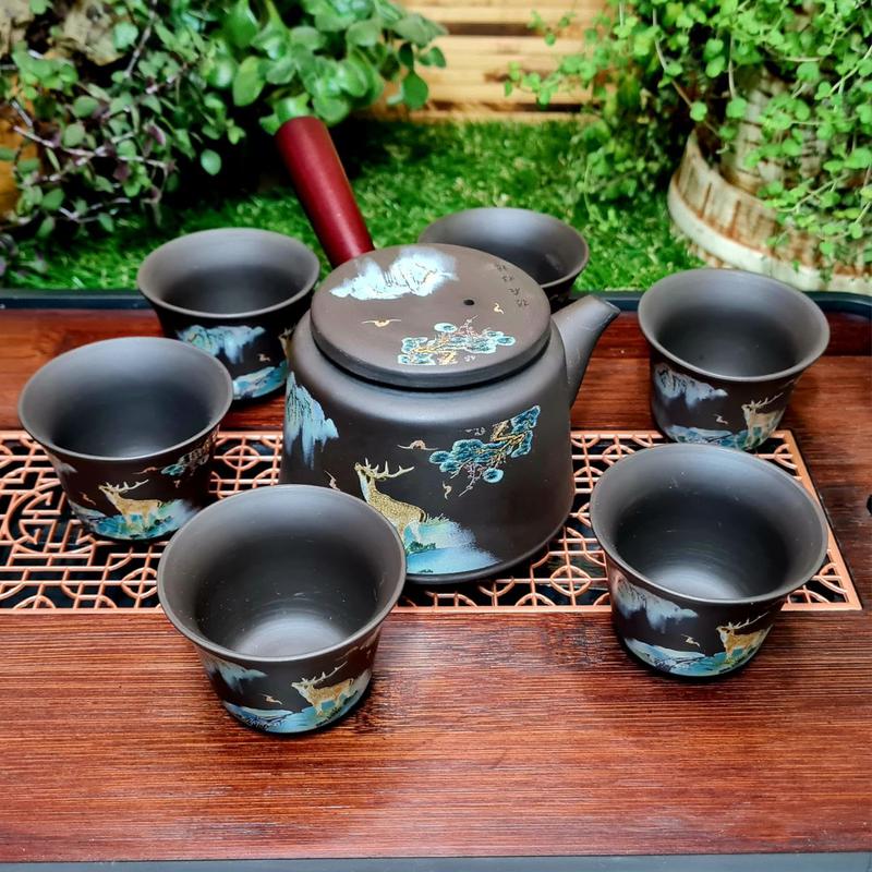 Наборы представлены в четырех различных вариациях узора (на фото в объявлении представлены все четыре вида наборов, дополнительные фото по запросу в сообщениях) Тигр Олень Персики Традиционный китайский Чайный набор из исинской глины, который имеет стильный эксклюзивный дизайн. Набор состоит из искусно выполненных и функциональных предметов, которые помогут вам провести чайную церемонию с легкостью и элегантностью.