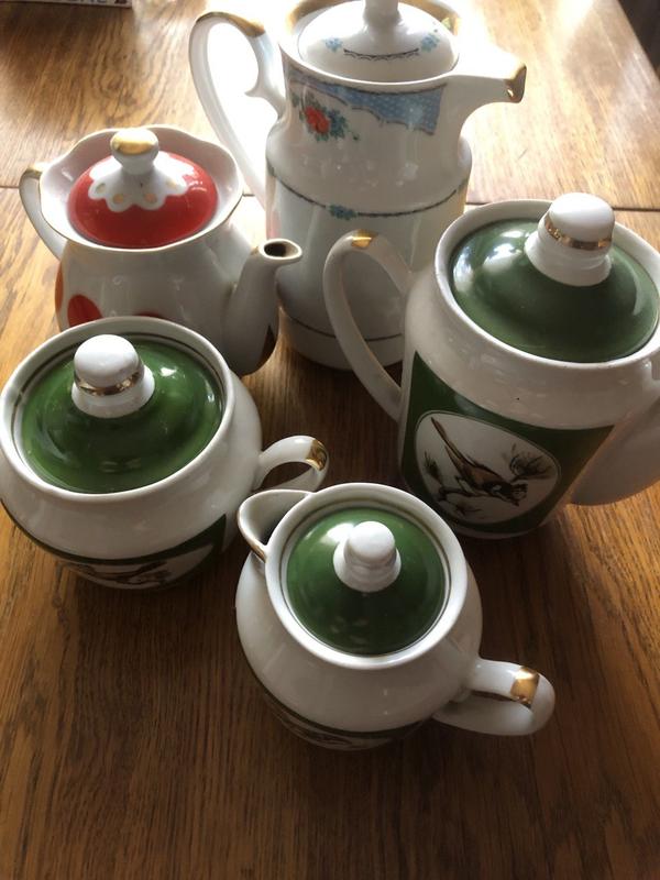 Набір із трьох заварювальних чайників, цукриці, вершчника. Антикварні чайники, цукорниця. Дивовижні малюнки на виробах. Зовсім недорого. Декоративна плиточка в подарунок.