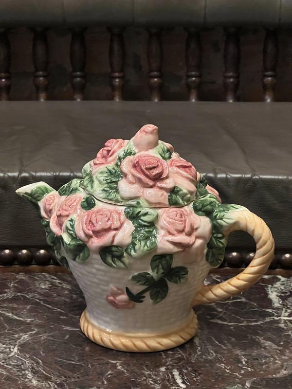 Винтажный коллекционный чайник с розами и птичкой Объем: 1000 мл Высота: 19 см Длина: 22 см Материал: керамика, ручная глазуровка Клеем: рельефное тиснение в виде ромба с цифрами 9-0-5 и буквой B (марковка фабрики, Европа, ХХ ст.) Изысканный винтажный чайник в форме корзины, отделанный объемными розами и листьями, а на крышке сидит птичка. Созданный в романтичном стиле, он может использоваться по прямому назначению или стать ярким декоративным акцентом в вашем интерьере. 📌 Стан: • Красивый, без трещин. • Есть незначительные сколы на декоре и у носика (хорошо виден на фото). • В целом сохранился отлично, учитывая возраст. Ценность: • Коллекционный винтаж ХХ ст. • Авторский объемный декор (розы + птичка). • Маркировка на дне (идентификация фабрики). • Редкая форма – декоративная посуда в стиле Shabby Chic / Cottagecore.
