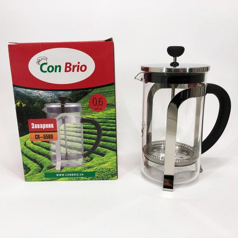 📣 Френч-пресс для ароматного чая Con Brio CB-5560 600 мл, Прочный френч- пресс из нержавеющей стали KT-67 ✨ Френч-пресс Con Brio СВ5560 станет отличным помощником на кухне для приготовления молотого кофе или заварного чая методом отстаивания и отжима. Является одним из самых удобных приспособлений, позволяющих сэкономить время и насладиться любимым напитком. ✨ На заваривание требуется гораздо меньше времени, чем в турке или обычном чайнике. Френч-пресс Con Brio СВ5560 отлично подойдет для ежедневного использования иди для сервировки праздничного стола, благодаря стильному и эффектному внешнему виду. ✨ Характеристика: - 🔸 Объем: 600 мл - 🔸 Материал колбы: Термостойкое стекло - 🔸 Материал корпуса: Нержавеющая стальк - 🔸 Цвет: Прозрачный / Черный - 🔸 Материал ручки: Пластик - 🔸 Можно мыть в посудомоечной машине: Да - 🔸 Тип: Френч-пресс 🔧 Дополнительные параметры - 🔸 Объем: 600 - 🔸 Состояние: Новое - 🔸 Ситечко: Есть - 🔸 Материал: Стекло - 🔸 Материал крышки: Нержавеющая сталь - 🔸 Производитель: Con Brio - 🔸 Пресс-фильтр: Есть - 🔸 Материал корпуса: Нержавеющая сталь - 🔸 Материал колбы: Термостекло - 🔸 Материал ручки: Пластик - 🔸 Тип посуды: Френч-пресс