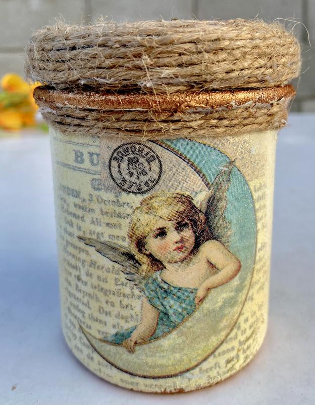 Задетженная стеклянная баночка с ангелятком и цветами для обновления и хранения воды 💦(0,3л) Крышечка украшена джутовой веревкой