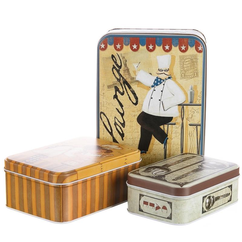 Набор из 3-х жестяных банок Bon appetit 18,5х13х6,5 см 1049JH материал-металл Набор жестяных коробок для хранения сухих продуктов. В наборе 3 емкости разного размера и дизайна. Подойдут для хранения конфет, печенья и других сухих продуктов. Коробки плотно закрываются крышкой. Такой вариант хранения предотвратит попадание влаги и поможет сохранить свежесть и аромат продуктов. Изготовлены из качественной луженой жести. Для экономии места пустые емкости могут быть сложены одна в другую. 1) 12х8х4,5 см; 2)14х10х5,5см; 3)18,5;13х6,5 см
