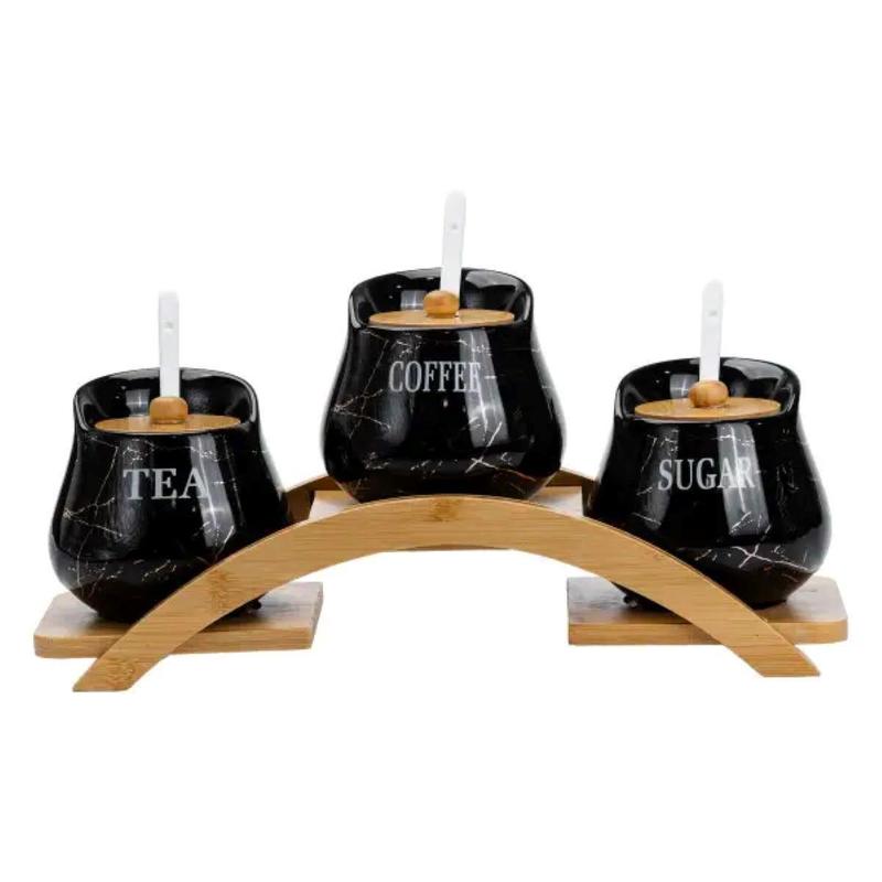 Набор для сыпучих продуктов сочетает элегантный дизайн и функциональность. Он состоит из трех баночек объемом по 500 мл каждая, которые выполнены в черном цвете с золотистыми прожилками, имитирующими мрамор. Этот стильный вид придает набору роскошности и современного вида. Основные характеристики: Материал банок: Керамика Материал подставки: Бамбук Высота банок: 20.5 см Объем банок: 500 мл Каждая баночка имеет бамбуковую крышку с удобной ручкой, что обеспечивает надежное хранение продуктов и легкость в использовании. Надписи на баночках - SUGAR, COFFEE и TEA - помогают быстро найти нужный продукт. Комплект дополняется бамбуковой подставкой для удобства хранения и организации на кухонном столе, а также ложечками, которые делают набор еще более практичным. Этот набор не только обеспечивает удобное хранение сыпучих продуктов, но и придает вашей кухне стильный и современный вид.