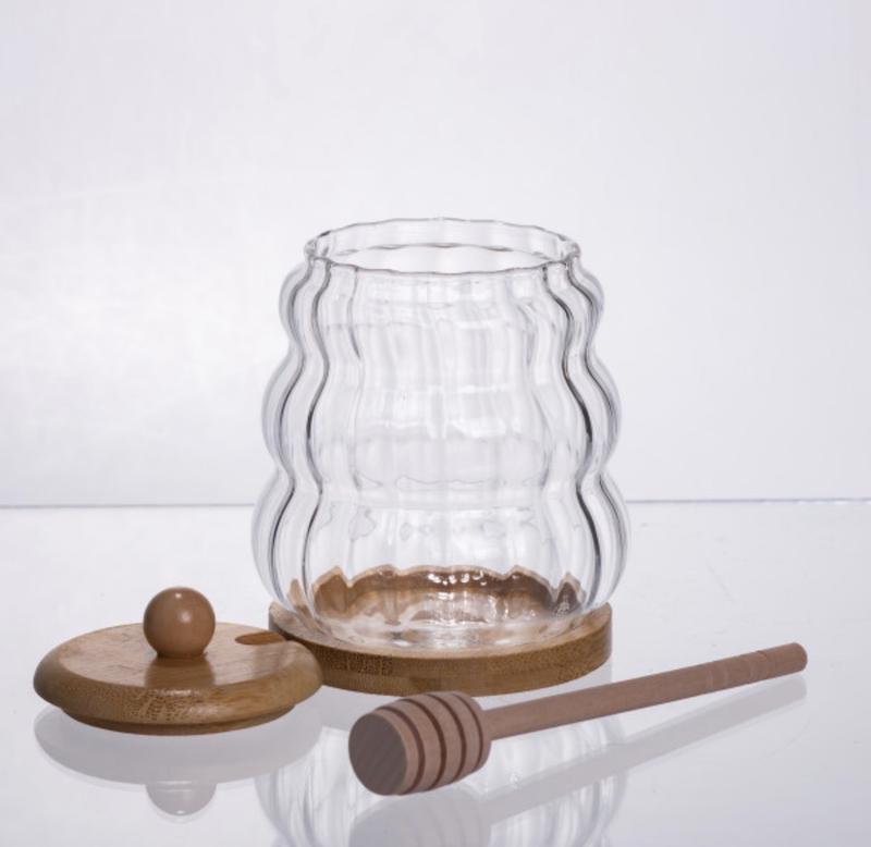 Скляна медовниця з бамбуковою кришкою та підставкою поєднує естетику, зручність і практичність. Прозоре скло дозволяє бачити колір і густину меду, а натуральний бамбук додає теплоти та природного вигляду. Конструкція з підставкою забезпечує стабільність і захист поверхні від липких крапель. Бамбукова ложка-веретино входить у комплект і вставляється у спеціальний отвір у кришці, що робить користування медом комфортним і акуратним. Усі елементи виготовлені з екологічно чистих матеріалів, стійких до впливу вологи та простих у догляді. Медовниця підходить для зберігання меду, сиропів або варення. Завдяки продуманій формі та приємному дизайну може стати не лише функціональним предметом, а й стильним елементом сервірування столу. Характеристики: Матеріал: скло, бамбук Об’єм: 320 мл Висота: 12 см Діаметр: 9 см Кришка: бамбукова Підставка: бамбукова Ложка: бамбукова, форма веретена