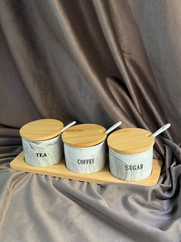 Набор состоит из трех фарфоровых банок для хранения сыпучих продуктов, таких как чай, кофе и сахар. Каждая банка имеет диаметр 8 см и объем 180 мл, что подходит для ежедневного использования на кухне. Банки расположены на прямоугольной бамбуковой подставке, которая обеспечивает стабильность и компактное расположение. Крышки изготовлены из бамбука, плотно прилегают к краям банок и помогают хранить содержимое сухим. В комплект входят три фарфоровые ложки, которые размещаются внутри каждой банки. Четкая маркировка на поверхности контейнеров позволяет быстро идентифицировать содержимое, что удобно для организации кухонного пространства. Общие размеры набора с подставкой – 28.5×10×7.5 см, вес – 900 г. Материалы – фарфор и бамбук – обеспечивают простоту ухода и нейтральный внешний вид, который легко сочетается с другими элементами кухонного интерьера. Характеристики: Тип: набор банок для хранения Количество: 3 штуки Объем каждой банки: 180 мл Диаметр банок: 8 см Материал банок: фарфор Материал крышек: бамбук Материал ложек: фарфор Материал подставки: бамбук Размер набора с подставкой: 28.5 × 10 × 7.5 см Вес: 900 г Комплектация: 3 банки, 3 крышки, 3 ложки, бамбуковая подставка