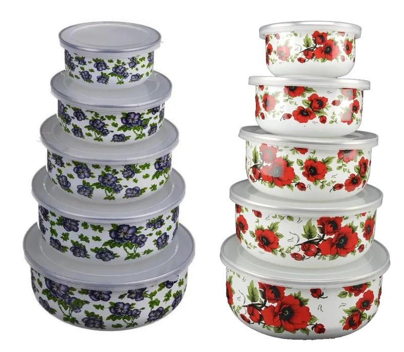 Набор судочков круглых A-PLUS 5 шт с красивым рисунком, Набор контейнеров круглой формы для кухни Набор контейнеров круглой формы это те высокопрактичные аксессуары для кухни, без присутствия которых ни обойтись, ни одной настоящей хозяйки! Прочный материал, со временем не теряет своих свойств, позволяет надолго сохранить продукты. Универсальны в использовании. В набор входит эмалированных 5 судочков различного диаметра. Подходит для приготовления различных блюд (салатов, соусов, омлетов и др.), а также для хранения продуктов. Набор прочный и удобный в использовании: занимают мало места при хранении, а также легко моются и чистятся даже после длительной эксплуатации. Характеристики: Набор судочков круглых 5 шт Эмаль - ### Тип: набор судочков; - ### Материал: эмалированное покрытие; - ### Материал крышек: пластик; - ### Форма: круглая; - ### Судочек: 9 см х 4.5 см.; - ### Судочек: 11 см х 5 см.; - ### Судочек: 13 см х 6 см.; - ### Судочек: 15 см х 7 см.; - ### Судочек: 17 см х 8 см.; - ### Цвет: белый с синими цветами и красными (учитывать при заказе цвет в случайном порядке). Комплектация: Набор судочков круглых Эмаль - ### Судочки - 5 шт.; - ### Крышки - 5 шт.; - ### Упаковка: заводская коробка.