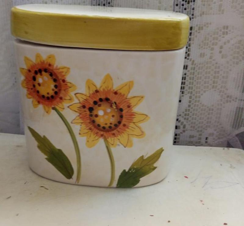 Керамическая банка для хранения соли в виде подсолнечников. Имеет яркий дизайн с цветами, украшающим кухню. Может использоваться для хранения соли или других сыпучих продуктов. Не пользовались. Оплата только на карту