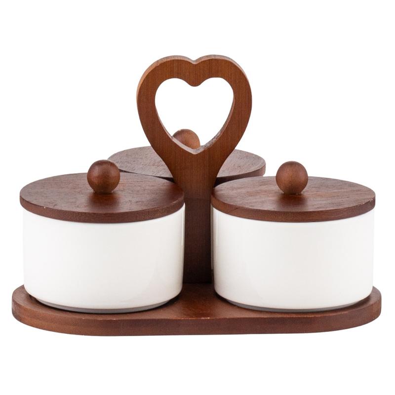 Размеры: высота емкости - 6 см, диаметр - 9,5 см, высота подставки - 15 см, длина - 21 см, ширина- 20,5 см. Набор емкостей для хранения — стильное сочетание натуральных материалов и изысканного дизайна. Емкости изготовлены из высококачественной керамики, которая обеспечивает прочность и долговечность, а крышки и подставка — из экологичного бамбука, что добавляет тепла и природного шарма. Благодаря герметичным крышкам продукты остаются свежими дольше, а стильный внешний вид отлично дополняет любой интерьер кухни или столовой. Набор подходит для хранения специй, сахара, круп или других сыпучих продуктов. Это не только практичный выбор, но и прекрасное украшение вашего дома. Идеально подойдет как подарок для ценителей стильной и функциональной посуды. ELISEY