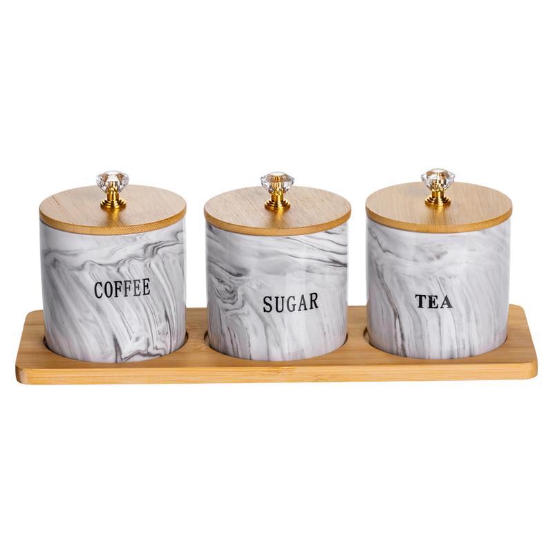 Набор из трёх фарфоровых банок с бамбуковыми крышками -- это практичное и элегантное решение для хранения чая, кофе, сахара и других сыпучих продуктов. Благодаря продуманному дизайну он помогает поддерживать порядок и добавляет изысканности кухонному пространству. Основные характеристики емкостей для хранения сахара, чая и кофе: Материал: фарфор, бамбук; Размер: 28.5×10×13 см; Диаметр баночек: 8 см; Высота баночек: 7 см; Объем баночек: 250 мл. Такой набор станет не только функциональным элементом кухни, но и стильным акцентом в интерьере. Он идеально подойдёт в подарок ценителям уюта и порядка, добавив в повседневный быт нотку элегантности.