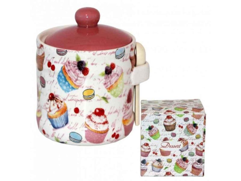 Керамическая емкость для меда с ложкой, модель Десерт. Данная емкость будет отличным дополнением для вашей кухни, так как имеет эстетичный вид и изготовлена из безопасного материала - керамики, которая отлично сохраняет все свойства продуктов, находящихся в такой емкости. Комплектуется ложкой и крышкой. Изготовленной из натурального дерева. Технические характеристики: Объем – 420 мл; Высота - 8.5 см; Диаметр – 10 см; Материал емкости – керамика; Материал ложки – дерево.