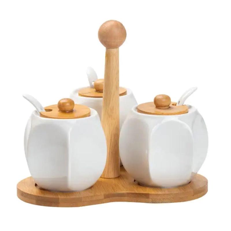 Стильный набор для сыпучих продуктов станет прекрасным дополнением вашей кухни, сочетая в себе функциональность, элегантность и удобство. В комплект входят три керамические баночки, каждая с бамбуковой крышкой и керамической ложечкой, а также бамбуковая подставка, которая удобно вмещает все три баночки. Характеристики: Материал банок: Керамика Материал подставки: Бамбук Объем баночек: 0.2 л Преимущества: Керамические баночки: Изготовленные из высококачественной керамики, баночки обеспечивают долговечность и сохранение вкуса и аромата специй. Керамика легко моется и не взаимодействует с содержимым, гарантируя чистоту вкуса. Бамбуковые крышки: Плотно закрываются, защищая содержимое от влаги и пыли, что помогает сохранять специи свежими и ароматными. Керамические ложечки: В каждой баночке есть керамическая ложечка, что обеспечивает удобное и чистое использование специй без необходимости в отдельных ложках. Бамбуковая подставка: Добавляет эстетической привлекательности и обеспечивает организованное хранение баночек. Подставка помогает поддерживать порядок на кухне и обеспечивает легкий доступ к специям. Легкость в уходе: Все элементы набора можно мыть в посудомоечной машине, что упрощает их обслуживание. Этот набор не только организует ваше кухонное пространство, но и добавляет нотку элегантности, став прекрасным дополнением для любой кухни.