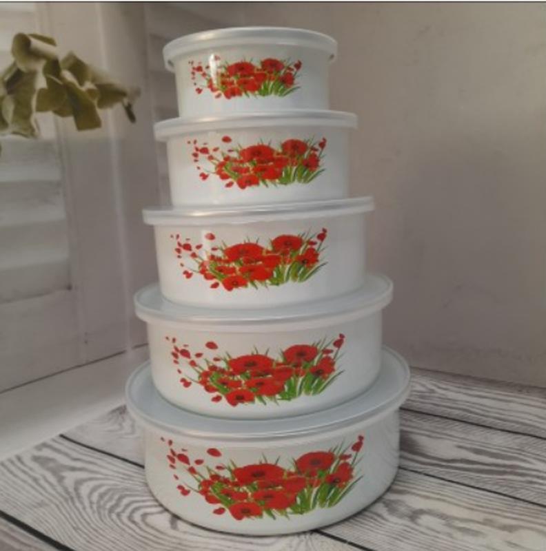 Пропонуємо купити набір круглих харчових контейнерів/судків з пластиковими кришками. Виготовлені із сталі покритою білою емаллю, прикрашені яскравим квітковим малюнком. Місткості екологічні, можна використати і для приготування, і для перенесення блюд. Завдяки пластиковим кришкам, в місткостях зручно зберігати продукти і приготовані блюда. У набір входить 5 судків (з кришками) різного розміру : Судок 9,5 см х 4,5 см Судок 11,5 см - 4,5 см Судок 13,5 см х 5,5 см Судок 15 см х 6 см Судок 17 см х 6,5 см