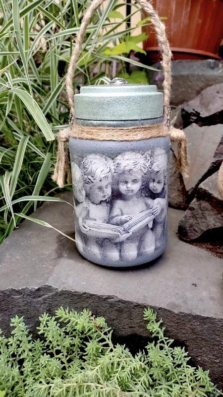 Ось, нарешті «дійшли руки» закінчити декорування баночки!!!(🥰 До «фіналу»,залишалося зовсім трішечки , але ось цих «чуть-чуть» і бракувало! Баночка з милими янголятками😇 для освячення та зберігання води( для зручності оздоблена ручкою з лляного шпагату) Об’єм-750 мл