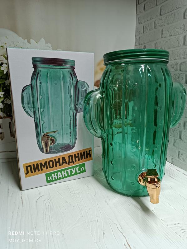 Типи — Лимонадник Кактус Диспенсер для напоїв, пунш (Лимонадниця) Матеріал — скло, метал Об'єм — 4 л Висота лимонадник 32 см Висота підставки 15 см Забарвлення — однотонний Основний колір — прозорий Паковання — Кольорове Країна-виробник — Китай Можливість миття в посудомийній машині — так. Лимонадник можна використовувати для розливання великого об'єму напоїв, вина, лимонаду, пунші. Може стати в пригоді у разі великого застілля, а також під час організації кейтерингу