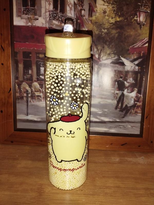 Бутылка для воды с дизайном персонажа Sanrio по имени Pompourin. Бутылка имеет прозрачный корпус с рисунком Pompourin и белых цветков. Внутри бутылки находятся белые шарики. На нижней части бутылки есть надпись "Pompompurin". Изготовлена из прочного пластика Tritan, и может быть предназначена для горячих или холодных напитков. Объем бутылки 0.5 литра. Имеет потертость на рисунке. Вказано на останньому фото
