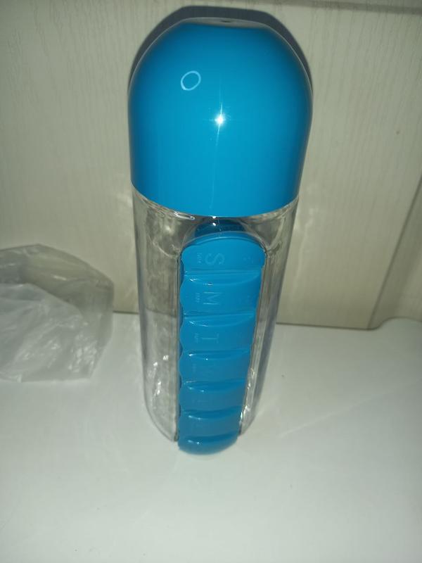 Нова пляшка для води з таблетницей одночасно. Дуже зручна річ, щоб не забути випити свої таблетки або вітаміни. Дуже містка, її особливість це 2 в 1. Легкість, зручність і функціональність це запорука гарного дня. Характеристики - органайзер для ліків: Матеріал: пластик Розмір: висота - 22 див.; діаметр - 7,5 см; Об'єм: 600 мл Органайзер: 7 клітинок Колір: блакитний Пакування: коробки одна пляшка