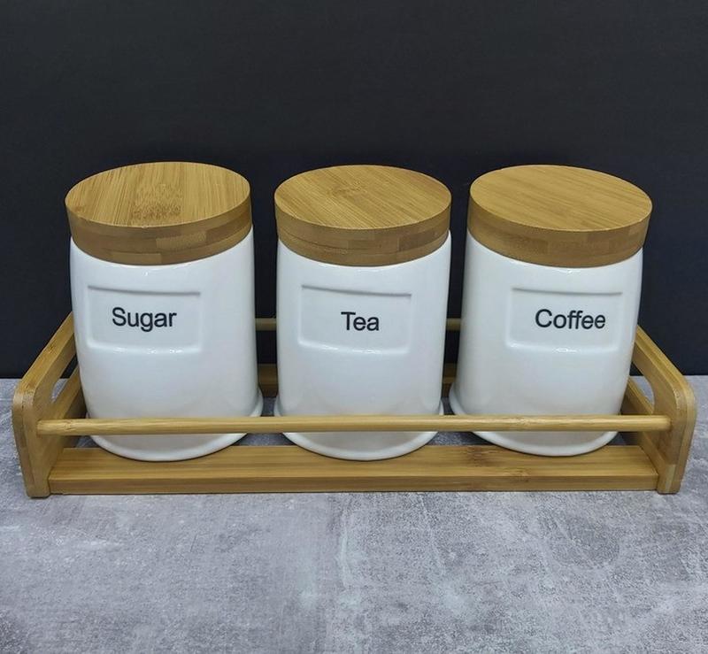 Набор банок 3 шт фарфоровых на подставке 600 мл с деревянной крышкой interos pj01783