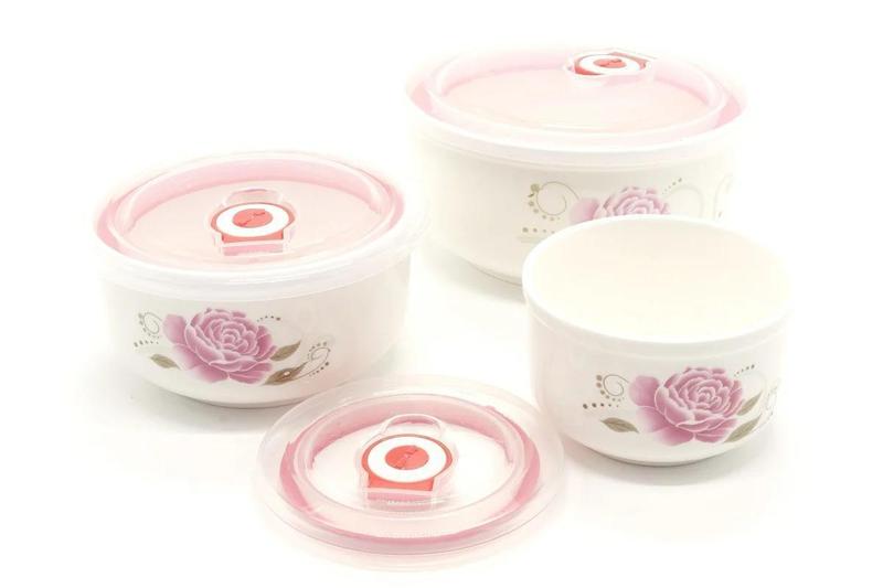 Судочки круглые с крышками изготовлены из качественной стеклокерамики, они надежны и долговечны, обладают повышенной термостойкостью. Посуду можно использовать в духовом шкафу и микроволновой печи. Емкости для продуктов с глянцевой поверхностью и рисунком, устойчивы к механическим и химическим воздействиям. Не впитывает посторонние запахи. Пластиковая крышка снабжена вакуумным клапаном и ручным индикатором даты. В таких пищевых контейнерах крышка фиксиртся с помощью специальных зажимов. Чтобы избавиться от воздуха внутри контейнера, следт нажать на центр крышки. Посуда упакована в яркую коробку станет хорошим подарком. Характеристики: Материал: керамика, пластик (крышки) Подходят для использования в микроволной печи Подходят для посудомоечной машины Комплектация: контейнер с вакуумной крышкой, 300 мл (Ø9,5 см) контейнер с вакуумной крышкой, 574 мл (Ø12,5 см) контейнер с вакуумной крышкой, 900 мл (Ø15 см)