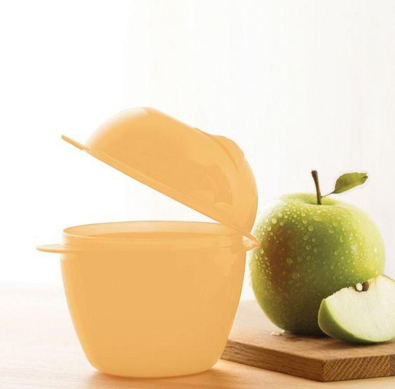 Здорове перекушування на ходу - це легко! Переваги Контейнер «Яблуко» призначений для транспортування яблук та інших фруктів аналогічної форми: персиків, апельсинів тощо. У нього також зручно класти виноград, помідори чері, морквяні та огіркові палички, печиво та крекери. Вміст контейнера не пам'ятається і не забруднює сумку. Контейнер закривається на замочок, який легко відкривати та закривати. Він надійно захищає вміст. Контейнер компактний та легко поміститься у сумку або рюкзак. Насолоджуйтесь свіжим хрустким яблуком у будь-який час та в будь-якому місці. У контейнері також можна зберігати та сервірувати мед або варення. Матеріал Еко+ проводиться за допомогою процесу піролізу, який полягає в нагріванні матеріалів, отриманих зі змішаних пластикових відходів, при підвищених температурах без доступу кисню для того, щоб розірвати молекули хімічні зв'язки. Піроліз пластмас здійснюється в повністю герметичній системі, при низькому тиску та інертній атмосфері. При розпаді молекули полімеру утворюють багаті насичені пари вуглеводнів, які потім перетворюються на нові вуглеводневі матеріали. Важливо, що у процесі полімер не горить. Технологічні установки на виробництві побудовані за європейськими стандартами, які забезпечують дотримання екологічних норм. Технічна інформація Не призначений для використання в мікрохвильовій печі та в морозильній камері. Можна мити в посудомийній машині. Не призначено для транспортування рідких продуктів. Ø 9,6 см х 10,8 см, 250 мл