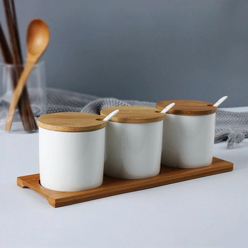 Набор вазочек для сыпучих 3 шт с крышками и ложками с бамбуковым подносом белые