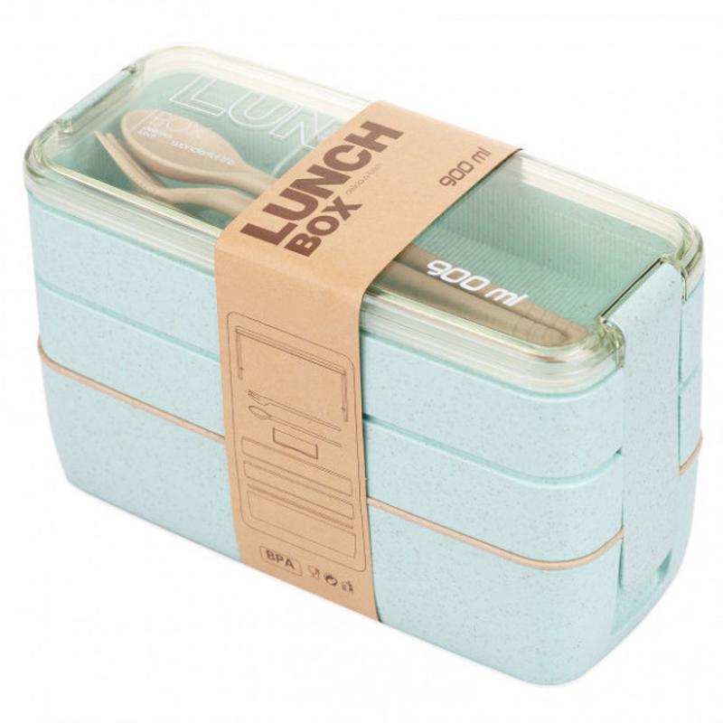 Ланч бокс тройной 900мл - компактный трехуровневый контейнер для еды, изготовлен из безопасного биоразлагаемого сырья (переработанные волокна пшеницы, солома, рис). Не токсичен, после утилизации полностью разлагается в течении нескольких лет. Lunch Box имеет удобную конструкцию и надёжные защелки. В верхнем ярусе есть передвижной разделитель. В крышке расположен резиновый уплотнитель. Можно использовать в морозильной камере, микроволновой печи, посудомоечной машине (без крышки и без разделителя ярусов). В комплектацию входят ложка и вилка.
