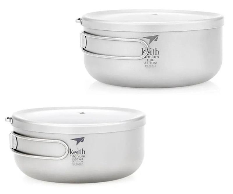Набор ланч боксов из титана Keith 800мл + 1000мл Можно приобрести как набором - так и по отдельности. Ланч бокс из титана Keith 800мл + чехол Производитель: Keith Цвет: титан (оригинальный цвет). Материал: титан Размер: 65*140 мм Вес с крышкой: 170г Емкость: 800мл Ланч бокс из титана Keith 1000мл + чехол Производитель: Keith Цвет: титан (оригинальный цвет). Материал: титан Размер: 71*150 мм Вес с крышкой: 200г Емкость: 1000мл Можно использовать для приготовления пищи на огне. Легкость и компактность особенно ценится во время долгих путешествий и походов, когда каждый грамм имеет значение! Почему именно титан? Титан - очень твердый металл. Он в 12 раз тверже алюминия, в 4 раза - железа и меди. Титан - легкий и прочный металл. Он в три раза легче стали, почти вдвое легче железа и лишь в полтора раза тяжелее алюминия. А вот в прочности титан не уступает стали: он в полтора раза прочнее. Титан - не ржавеет. Посуда хорошо держит тепло и не вступает в реакцию с едой и напитками, а горелки из титана очень надежны и долговечны, если не потеряете - передадите по наследству:) В наличии большой выбор: наборы посуды, кастрюли, котелки, сковородки, чайники, чашки, рюмки, стаканы, тарелки, фильтры для чая и кофе, столовые приборы, фляги и бутылки, термосы, газовые горелки, спиртовки, решетки гриль, колышки, лопатки, щепочницы из титана разных размеров. Поэтому, если именно этот товар Вам не подходит, напишите в любой мессенджер или на сайте и я пришлю Вам ссылку где есть весь перечень изделий из титана, и возможно подскажу что лучше для ваших нужд. Приятных покупок :)