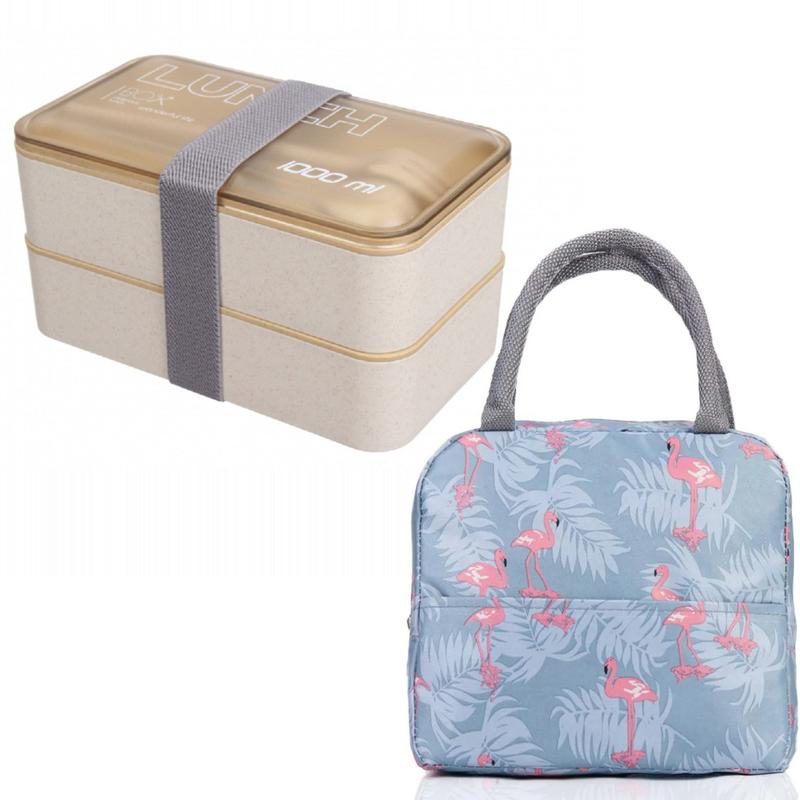 Набор для еды с собой bento ланч бокс эко 1000 мл бежевый и термосумка flamingo серая